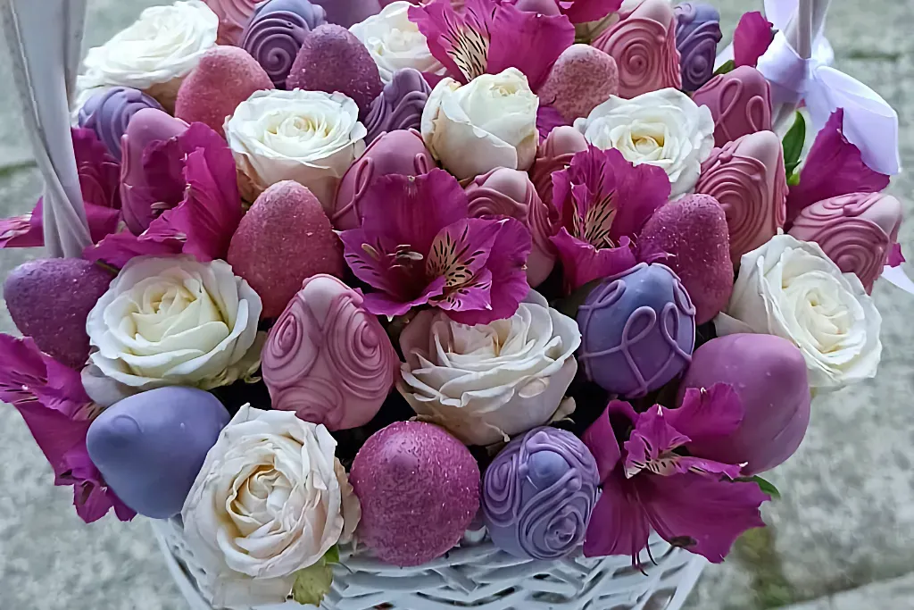 В чем уникальность корзины с клубникой и цветами?
